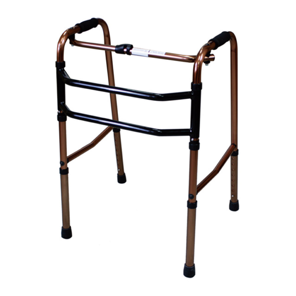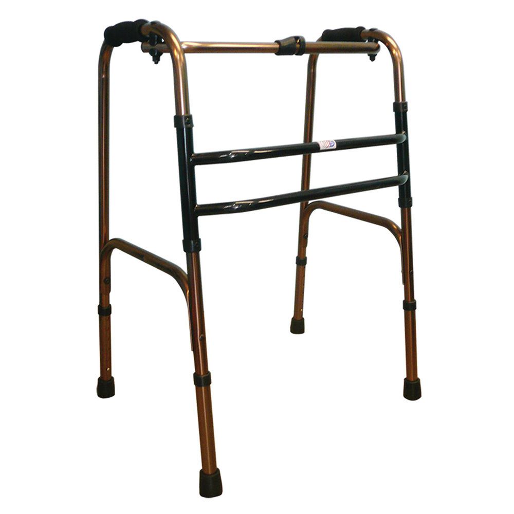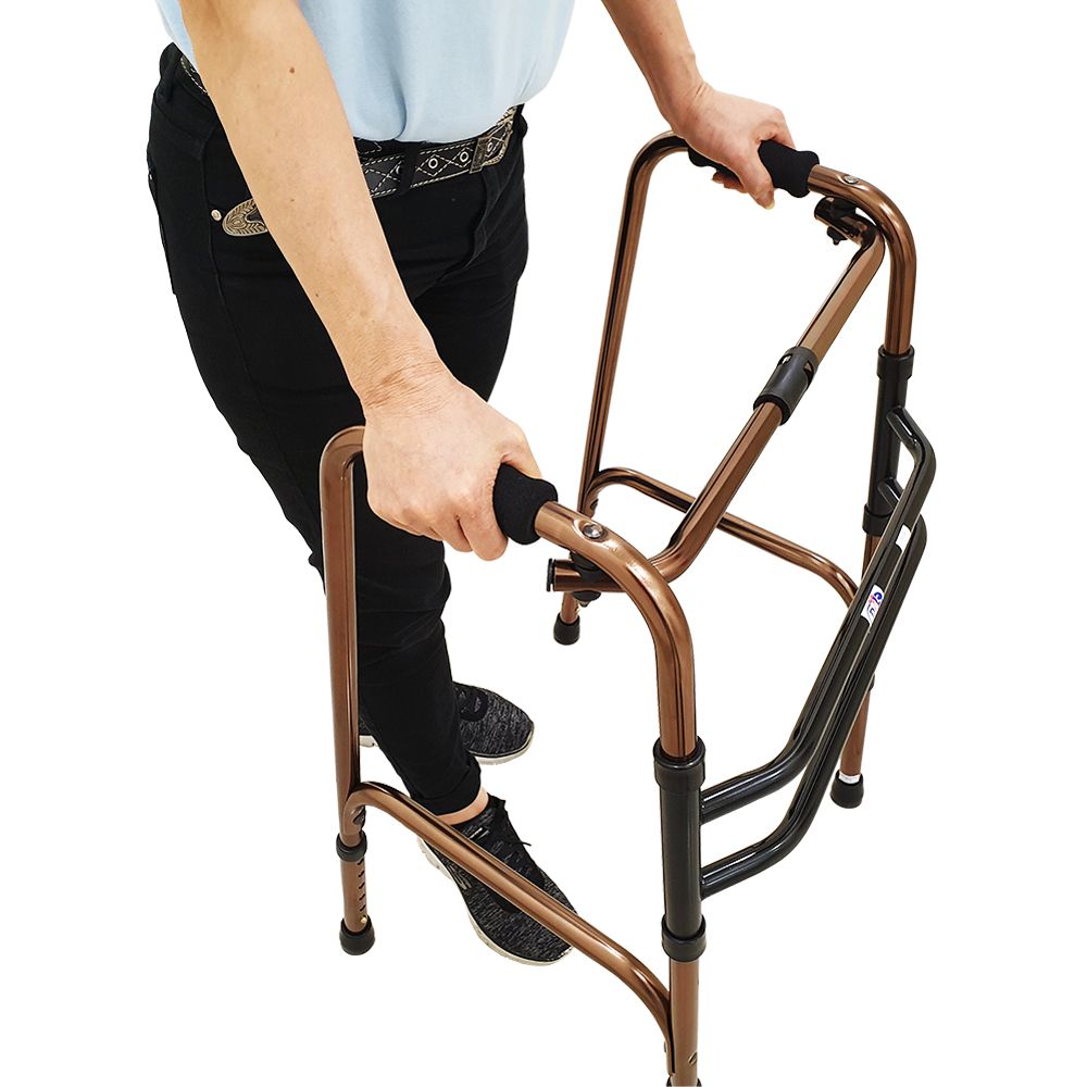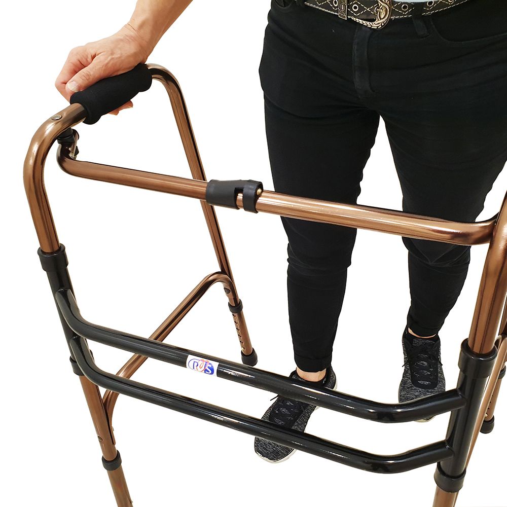 Move right and left without lifting. Each side of the frame moves alternately, giving complete stability, and maximum freedom of movement. Double steel cross braces for extra stability. One button release allows users to fold walker easily.
