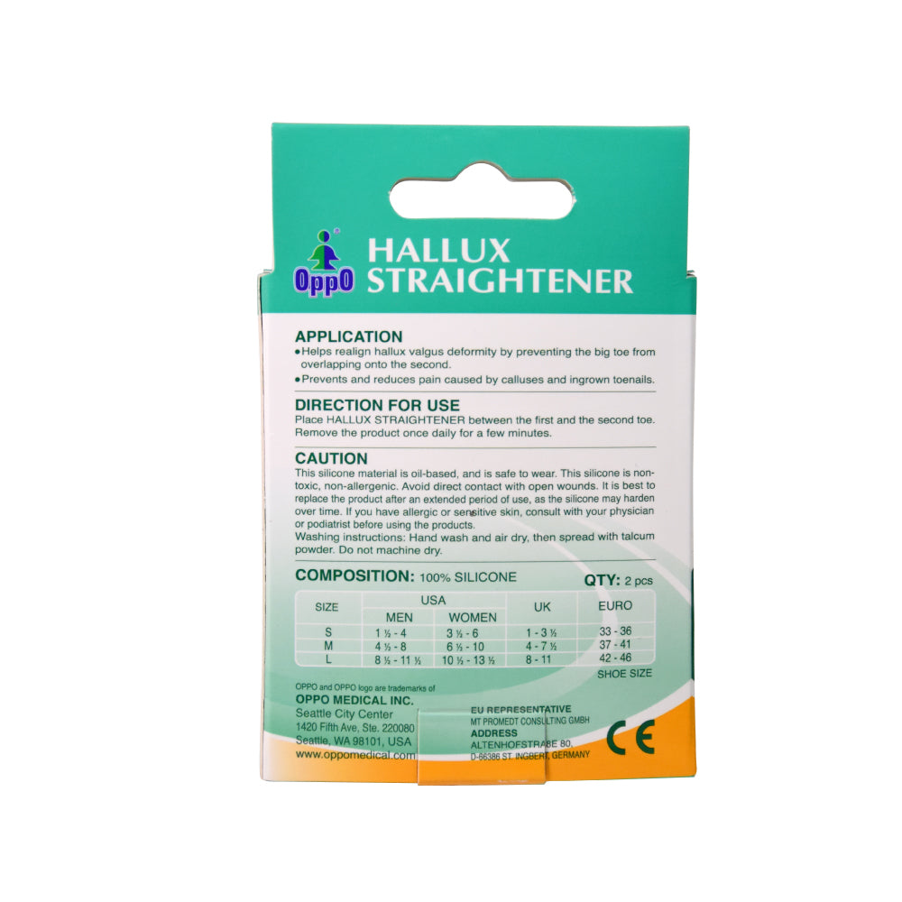 - Place Hallux Straghteners between the first and the second toe. Remove the product once daily for a few minutes.